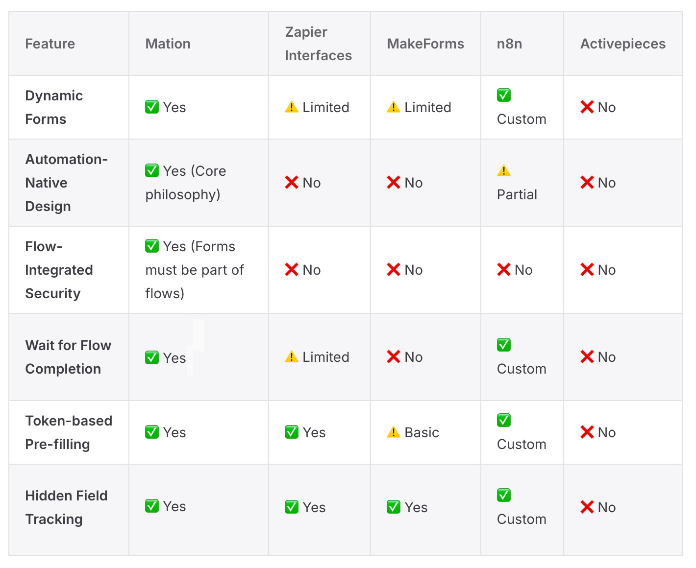 Mation takes a completely different approach. Unlike many platforms that depend on external tools, Mation Forms are fully built-in, automation-native, and dynamically integrated into your workflows.