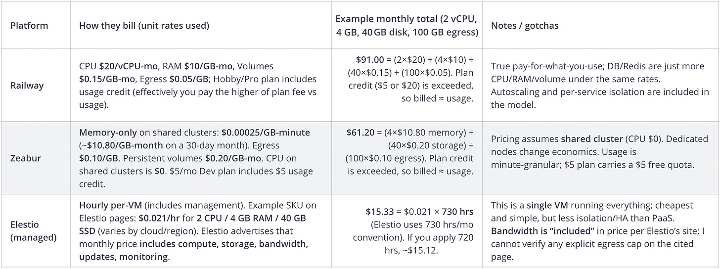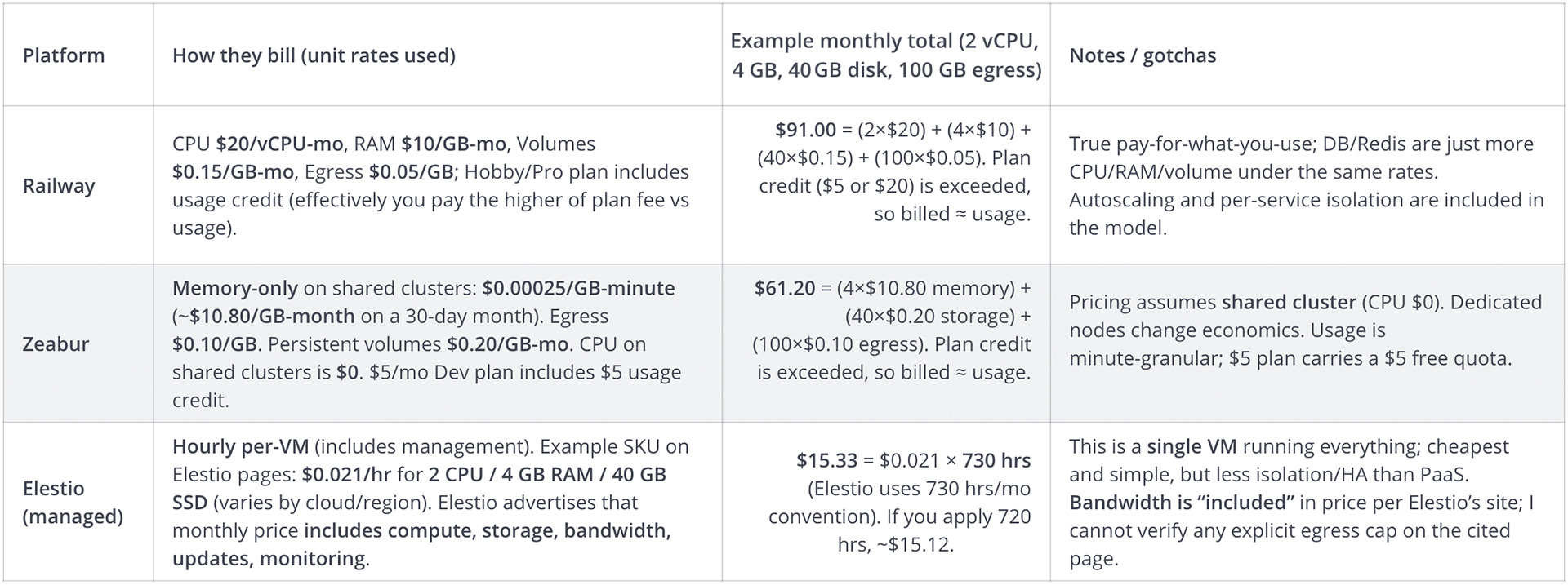 Zeabur: Memory($0.00025×GB×minutes) + Vol($0.20×GB) + Egress($0.10×GB) → (4 GB × 43,200 min × $0.00025 = $43.20) + $8 + $10 = $61.20.